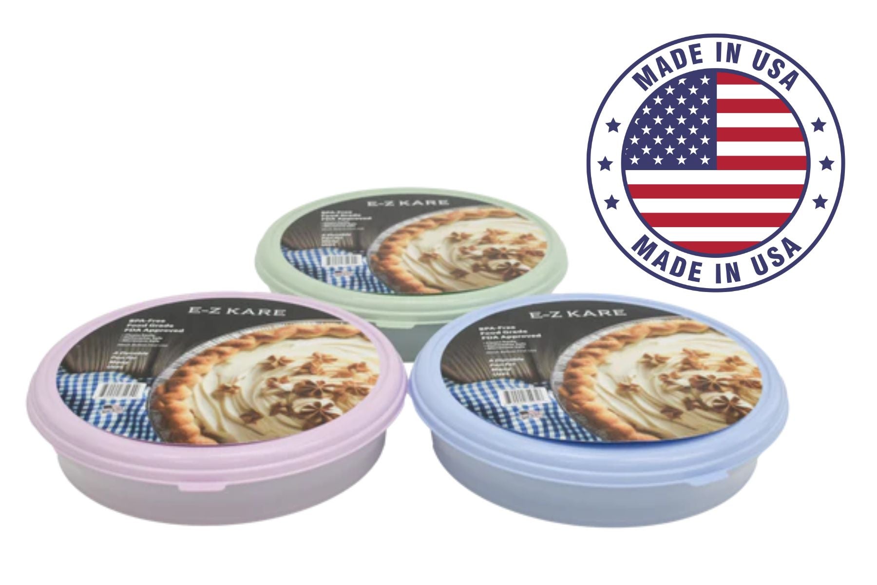 The EZ Kare Pan is a food-grade, BPA-Free food storage container that is great for all of your favorite foods. The raised lid is great for pies and other items with raised toppings that need more space and is available in Pink, Green, and Blue. The EZ Kare Pan is 11-1/2” wide and 2 inches deep. Made in the USA